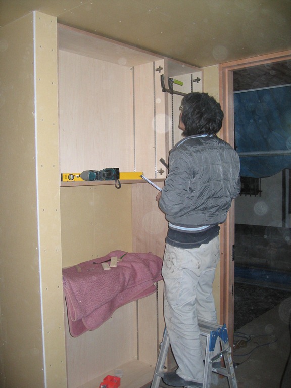 壁に家具を設置する場所の印をつけているところ(私、本人です・・恥ずかしいので顔は映してません)