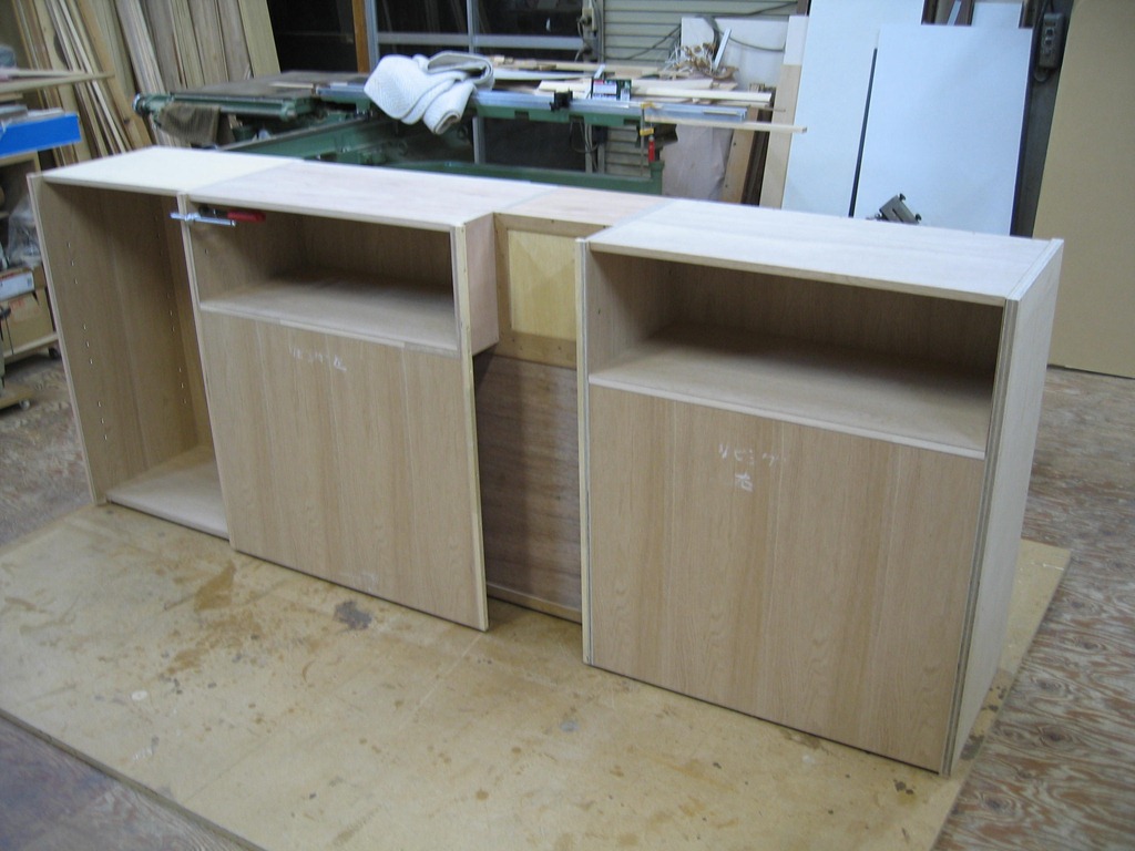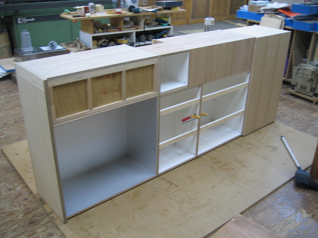打ち合わせの時は、引き出しのみポリ合板(白い部分)で内部はシナ合板でしたが汚れなどの事を考えて自己判断でポリ合板にしました。