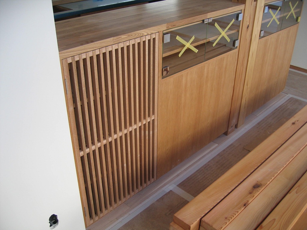 手前の家具にガラス扉と格子扉を取り付け。