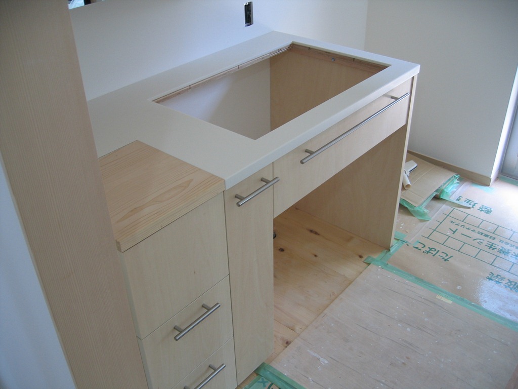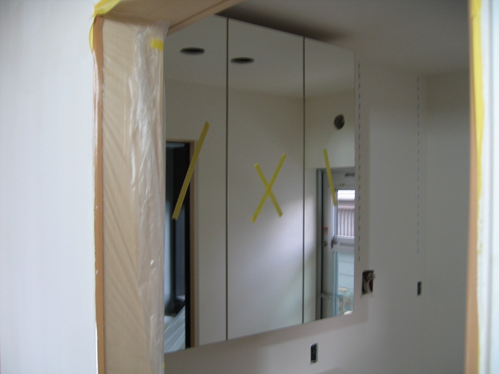洗面台をセットしメディシンボックスの取り付け準備中。