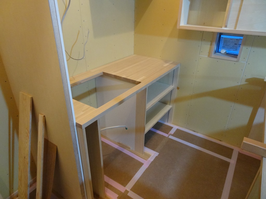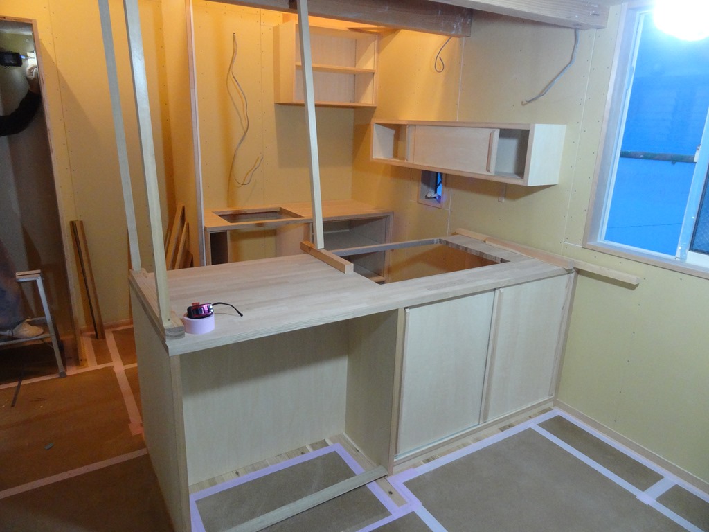 座間S邸4 2019年3月15日 最終更新日時 : 2019年3月15日 高見 耕 本日取り付けでした。 シンク開口の前部分が細くなってしまったので補強をいれました。 コンロ台 材料はシナ合板に木口は杉の挽き板です。 塗装すると綺麗になりそうな組み合わせですね。 後はレンジフードカバーとステンレスシンクの取り付けです。 設備が入らないとキッチンは引き締まらないですね。 今回の大工さんとは次回東京の現場で再会予定です。 \ 最新情報をチェック / FacebookXBlueskyHatenaCopy