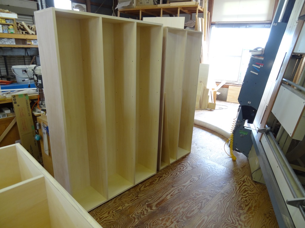 M邸は2Fのレコード収納棚と階段横の本棚から製作です。