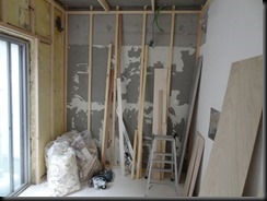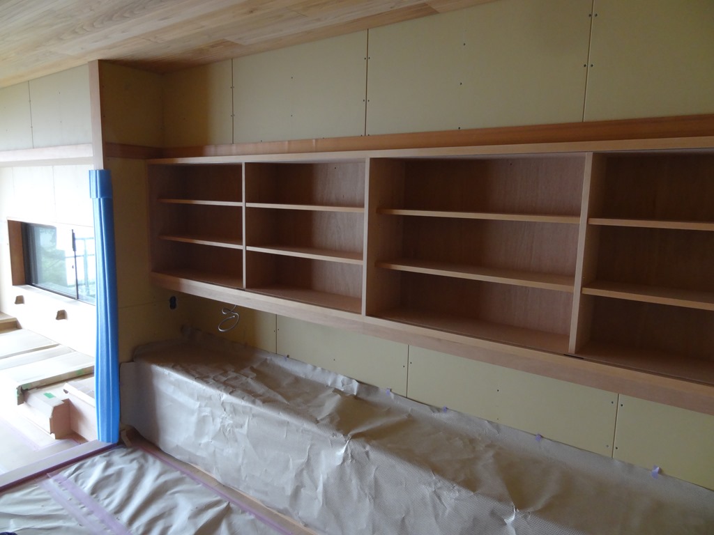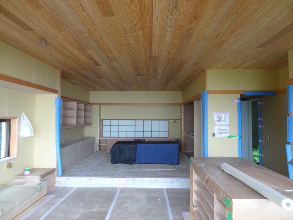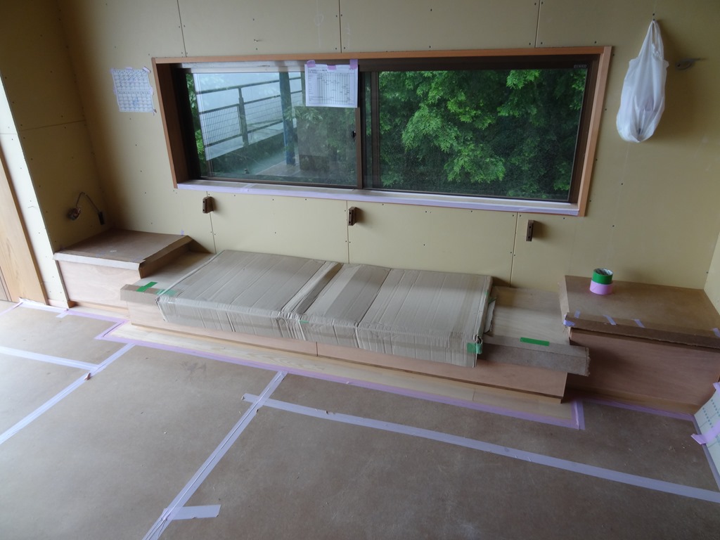 ソファ 背もたれはチーク無垢材ですが壁の左官が終わるまで