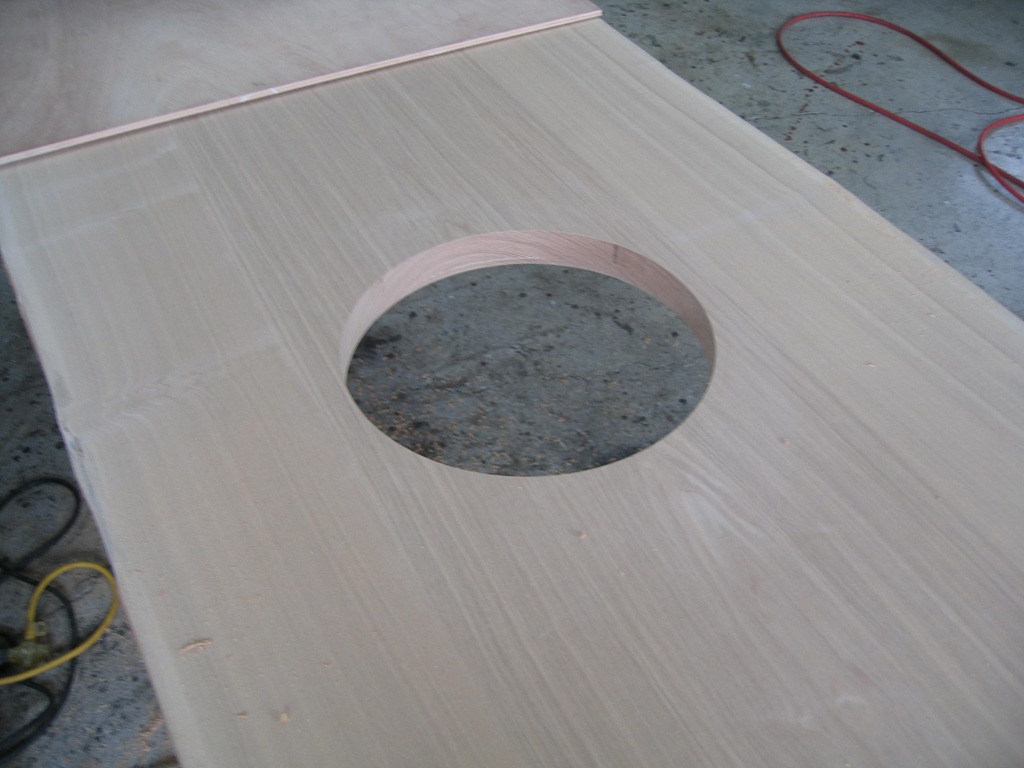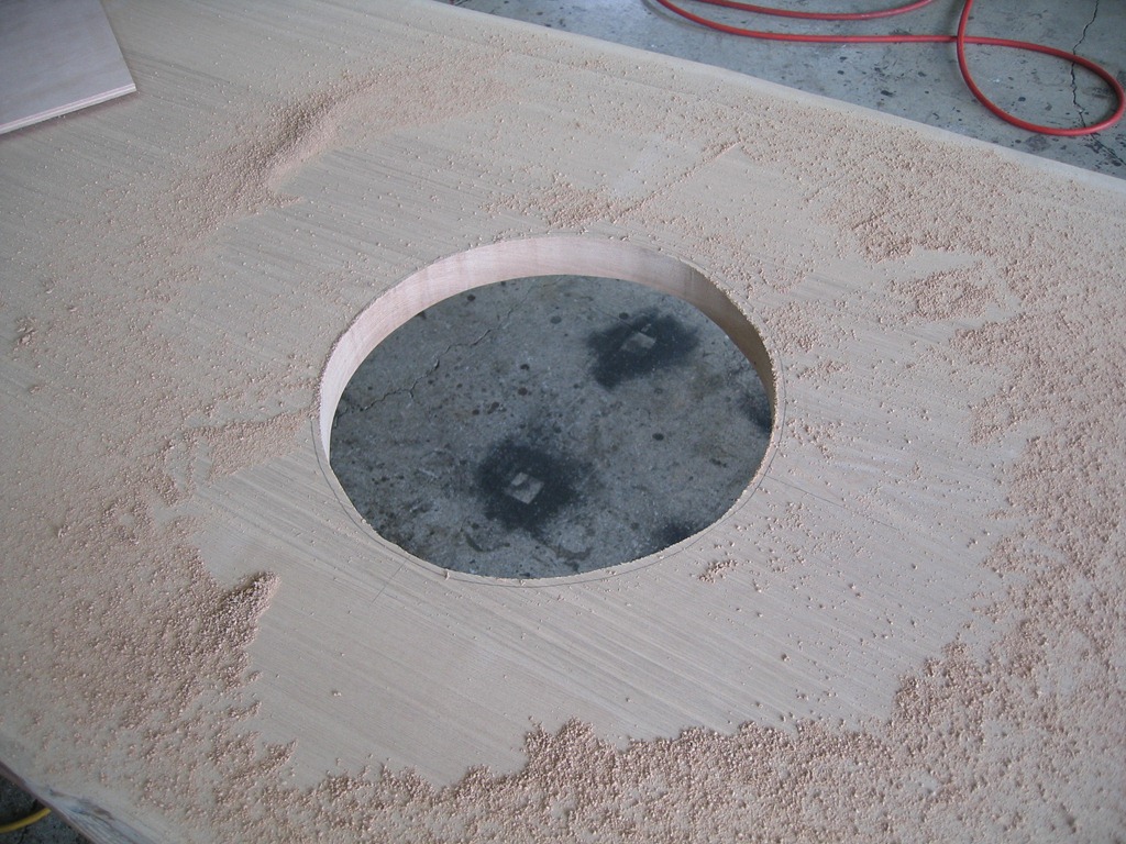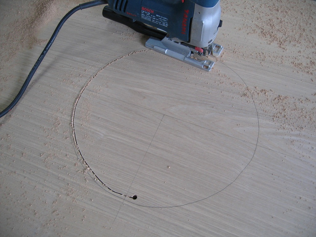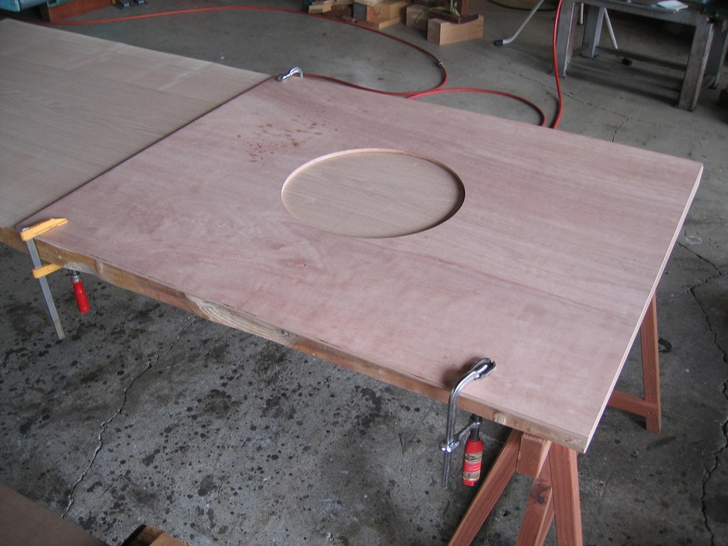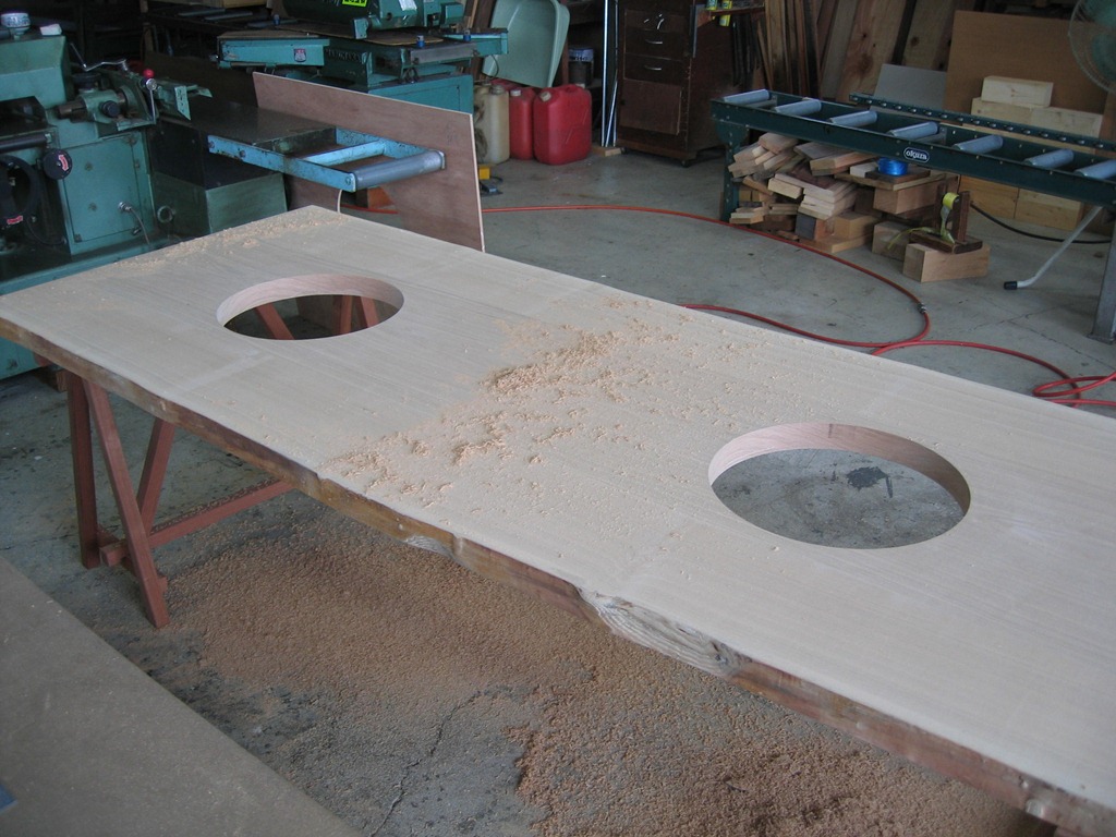 材木屋さんで天板穴あけ加工