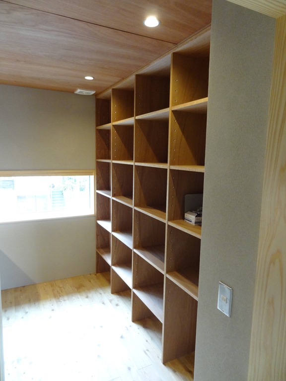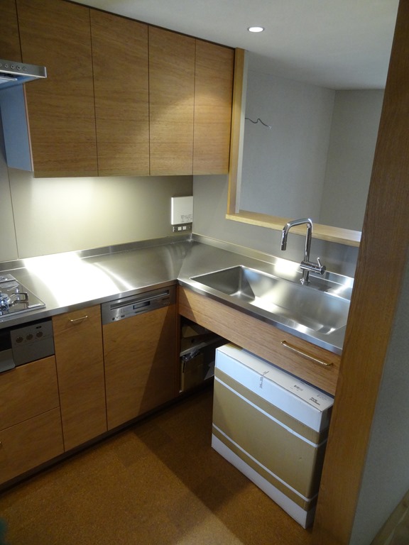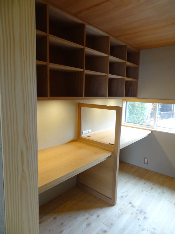 階段と壁が仕上がる前に天板のみ搬入し後日下台家具の設置