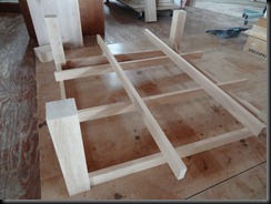 コタツ机製作中。 仮置き中。 一応、真ん中にこたつファンが設置できるように 開口するつもりです。 塗装中。 手前が脚で...