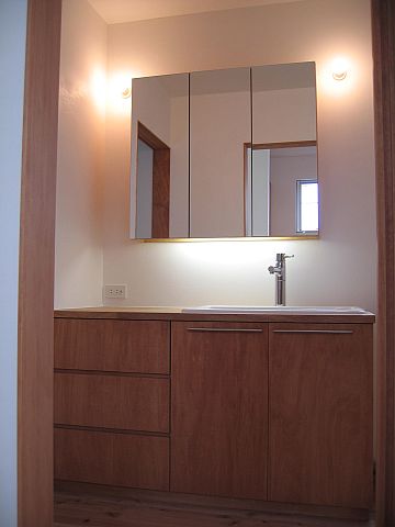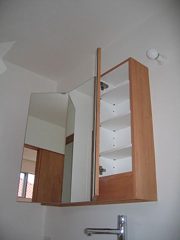 メディシンボックス鏡扉は、3面鏡になってます。隣がバスルームのため鏡が湿気で腐食するために防食ミラーを使用しました。