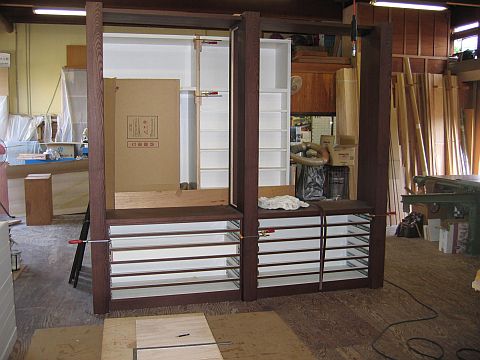 この家具はデザイン、設計、製作、塗装、施工全て当社で行いました。デザインから考えると、製作の時に作りやすくと考えてしまいがちですが余計な事を考えずにデザインから進め、製作の段階で多少大変でした。