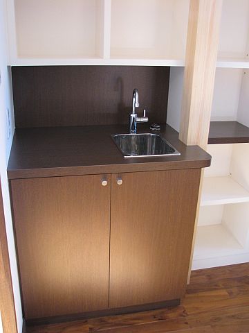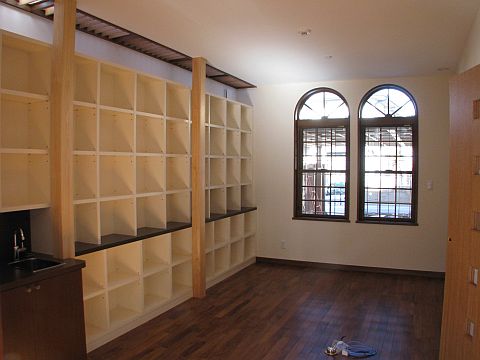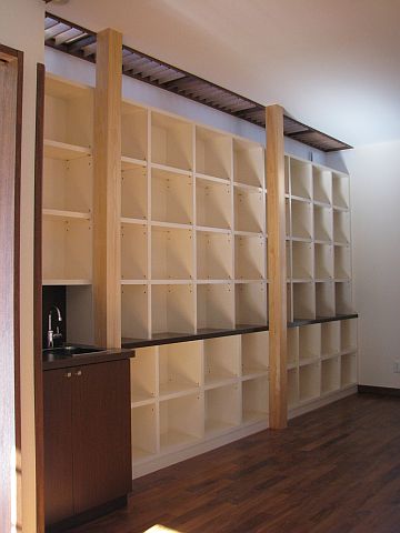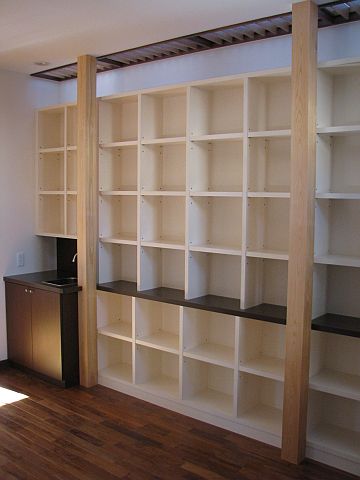 書斎に簡単なシンクを取り付けることになった本棚です。設置方法にはかなり悩ませられ、結果、柱と柱の間から順番に家具を入れて取り付けする事が一番綺麗に収まると思い6分割で製作することになりました。