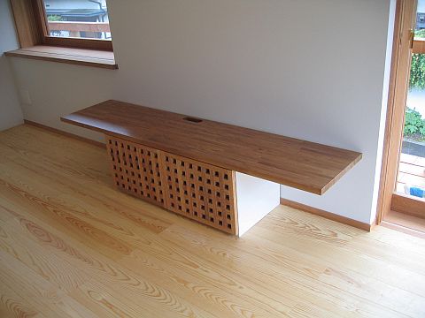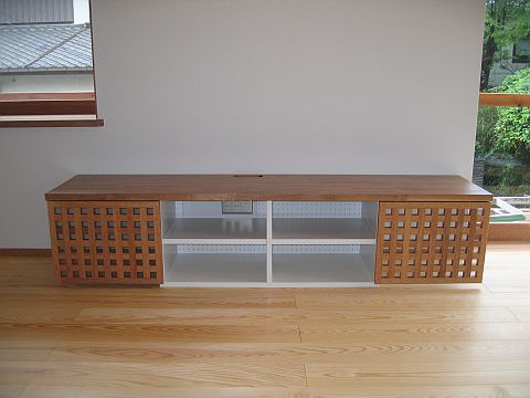 この家具は置き家具として製作しました。ひき違い戸の吊り金物の取り付け方には苦労しました。