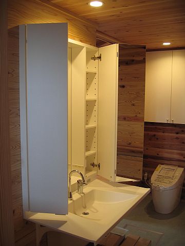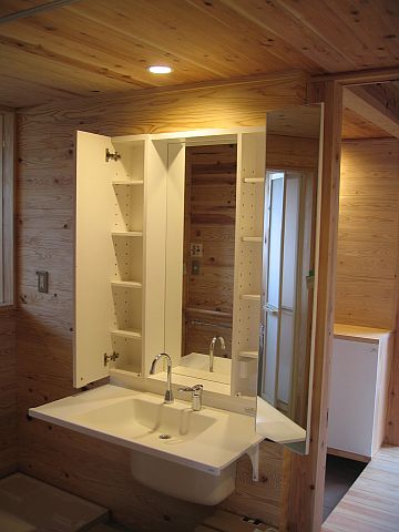 本体は壁面材を貼る前に取り付けたので壁との収まりも綺麗にいきました。左隣がバスルームのため防食ミラーを使用しました。